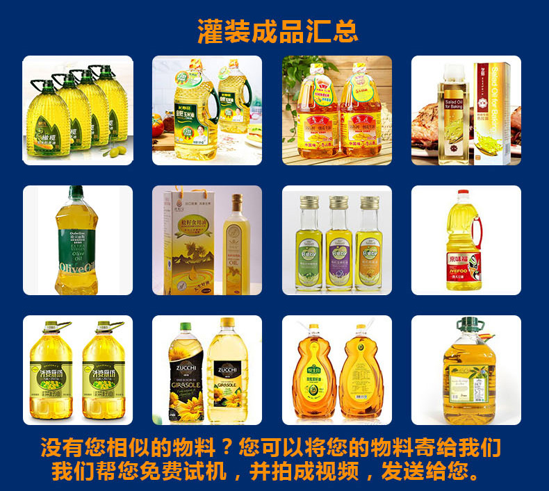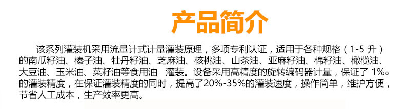 該系列灌裝機(jī)采用流量計(jì)式計(jì)量灌裝原理,多項(xiàng)認(rèn)證,適用于各種規(guī)格(1-5升)的南瓜籽油、榛子油、牡丹籽油、芝麻油、核桃油、山茶油