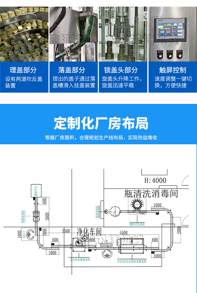 本設備適用于醫(yī)藥、農藥、食品、化妝品、化工等行業(yè),主要針對各種玻璃瓶口的金屬防盜蓋、鋁封蓋的封口、壓螺紋等。該設備可單機使用,也可以與灌裝機等設備組成生產流水線自動作業(yè);