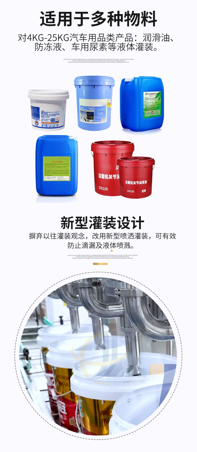 全自動(dòng)稱重式灌裝機(jī)適用于多種物料,對4kg-25kg汽車用品類產(chǎn)品:潤滑油、防凍液、車用尿素等液體灌裝。