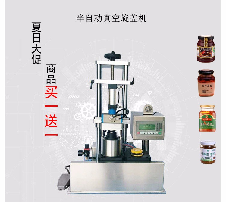 這款小型辣椒醬封口機主要用于食品包裝,采用標(biāo)準馬口鐵爪式旋開蓋封口的玻璃瓶包裝??蓪崿F(xiàn)的功能是抽吸包裝容器內(nèi)的空氣使其達到設(shè)定的負壓值(即抽真空),然后旋緊蓋子。 為半自動機型,即人工進出瓶,人工配蓋,其他過程自動。